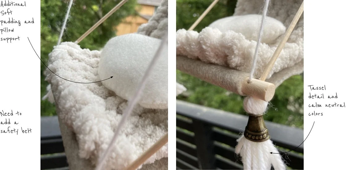 We researched the best of what institutional solutions had to offer in the way of safety and mobility and then re-thought the chair with a “hygge” sensibility to create a solution that is comfortable and inviting. We chose warm soft colors, added tassel details, a cushioned a headrest, and extra fluffy padding in the boho aesthetic that is Em’s style.
